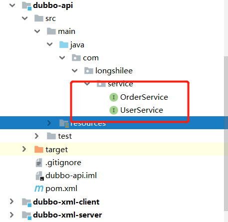 使用开发工具搭建一个maven项目,项目中有三个子项目,名称自取,我这的示例为:dubbo-api、dubbo-xml-server、dubbo-xml-client