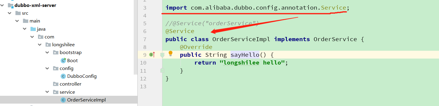 - 将OrderServiceImpl上的注解 - @Service,由spring的注解换成dubbo的- @Service注解。