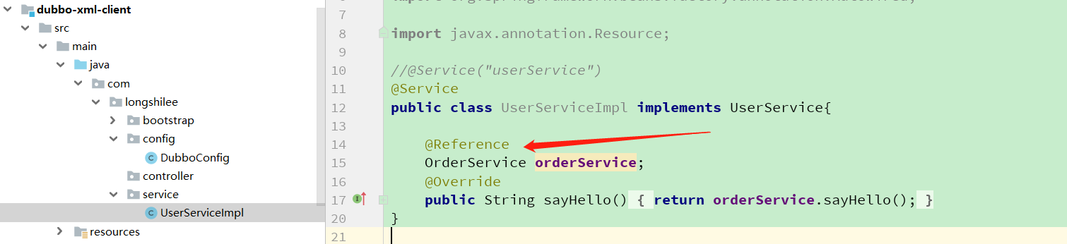 - 调用OrderService时,由原来使用的注解 - @Resource改成dubbo的- @Reference,来完成Bean的自动注入。